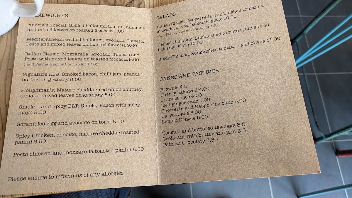 Cakes and Pastries: A variety of baked goods are available for those looking for a sweet treat or a snack with coffee. Options include brownies, cherry bakewell, iced ginger cake, carrot cake, lemon drizzle, and traditional pastries such as croissants, pain au chocolat, and buttered tea cakes.