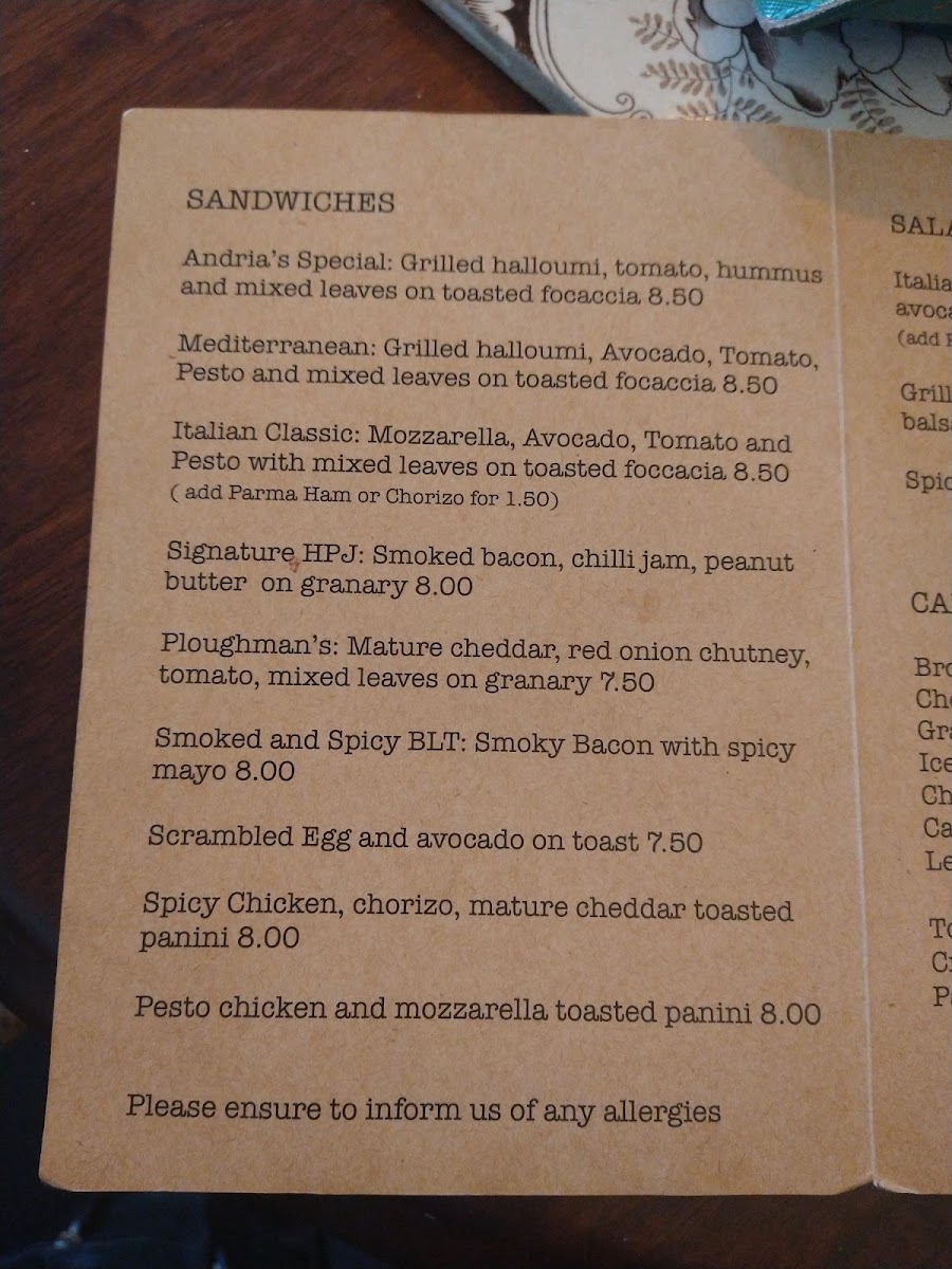 Sandwiches and Toasted Paninis: This category includes a variety of sandwiches such as Mediterranean, Italian Classic, Ploughman’s, and several signature options. Toasted paninis are also available, featuring fillings like spicy chicken with chorizo and mozzarella with pesto chicken. Some dishes, like scrambled egg and avocado on toast, provide lighter, simple meal choices.